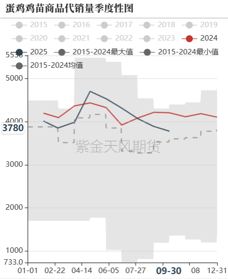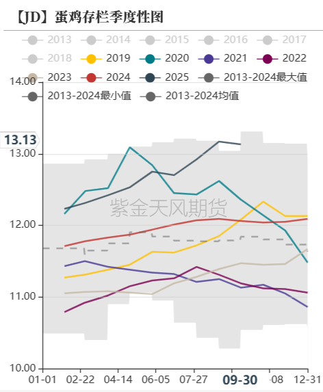 四季度的新增产能对应是6-9月的鸡苗补栏量,这几个月鸡苗补栏呈现环比下滑的趋势,同比在近十年均线附近。四季度新增产能虽然环比下滑,但一、二季度补栏的鸡苗在同期高位,这个时间段补栏的鸡苗在四季度处于产蛋高峰期,因此在现有在产蛋鸡产能历史最高水平的情况下,新增产能环比下滑对产能减缓的压力有限。