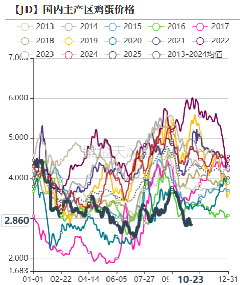 10月以来随着现货价格下跌,养殖利润亏损扩大,养殖端淘鸡积极性增加,加上中下游企业抄底意愿增加,缓解阶段性供应压力,现货止跌企稳,市场悲观情绪略有缓解。截止到10月23日,主产区鸡蛋均价为2.86元/斤,较上周同期上涨0.03元/斤,河北邯郸鸡蛋均价为2.53元/斤,较上周同期上涨0.1元/斤。