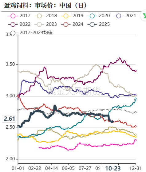 截止10月23日,饲料价格为2.61元/斤,较上周同期下跌0.09元/斤;蛋鸡养殖利润为-0.4元/斤,较上周同期下跌0.2元/斤。目前大部分主产区的现货价格持平或低于饲料成本,在考虑到边际利润的情况下,预期市场淘鸡节奏受现货价格波动影响较大。近日玉米及豆粕饲料原料期货价格上涨,在增加饲料成本的同时,也抬升鸡蛋价格下方支撑位。