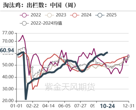 钢联数据显示,22025年9月底在产蛋鸡存栏量约为13.13亿只,环比减少0.3%,同比增幅7%。卓创数据显示,2025年9月底在产蛋鸡存栏量约为13.65亿只,环比增幅0.2%,同比增幅6%。两家机构存栏环比数据有小幅分歧,但9月中下旬淘鸡量较大以及新增产能环比下降,因此至少9月在产蛋鸡存栏量环比增幅缩窄,但同比仍在高位。10月因现货价格跌幅较大,淘鸡节奏加快以及新增产能环比下降,预期10月在产蛋鸡环比存栏小幅回落。