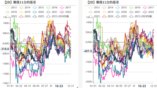 目前进入交割月的2510合约以及临近交割月的2511合约均呈现升水状态。这主要是河北低价区粉蛋价格在2.5元/斤附近,低于饲料成本。在深度亏损的情况下,养殖端淘鸡节奏较快,市场会在阶段性较快的淘鸡后,寻找新的供需平衡,因此2.5元/斤的现货价格并不会持续太久,市场预期10月底及11月现货价格会有一定的反弹。而2512合约以及2601合约的升水环比增加,除了10月以及11月预期淘鸡节奏加快,还有新增产能环比回落以及需求端环比增加的因素。