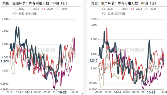因10月中旬以来市场淘鸡节奏较快,中下游补货积极性较高,生产及流通环节库存整体呈现持续回调趋势。截止到2025年10月23日,全国生产环节库存为1.24天,较上周同期下降0.25天;流通环节库存为1.32天,较上周同期减少0.21天。