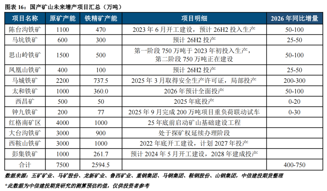 展望2026年,预计国内铁矿总体产量或小幅增长。增量的主要来源包括河北马城铁矿项目、辽宁思山岭铁矿项目、陈台沟铁矿项目以及其他矿山部分增产项目。2026年预计国内矿山产量同比增量在400-750万吨。另外,2025年8月,工业和信息化部等五部门印发文件《钢铁行业稳增长工作方案(2025-2026年)》,方案中提到稳定原燃料供给,加快国内重点铁矿项目开工投产、扩能扩产,支持合规矿企正常生产,避免行业整顿措施“一刀切”。在此背景下,国产铁矿项目开工有望提升,新项目建设有望提速。