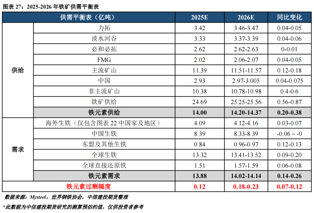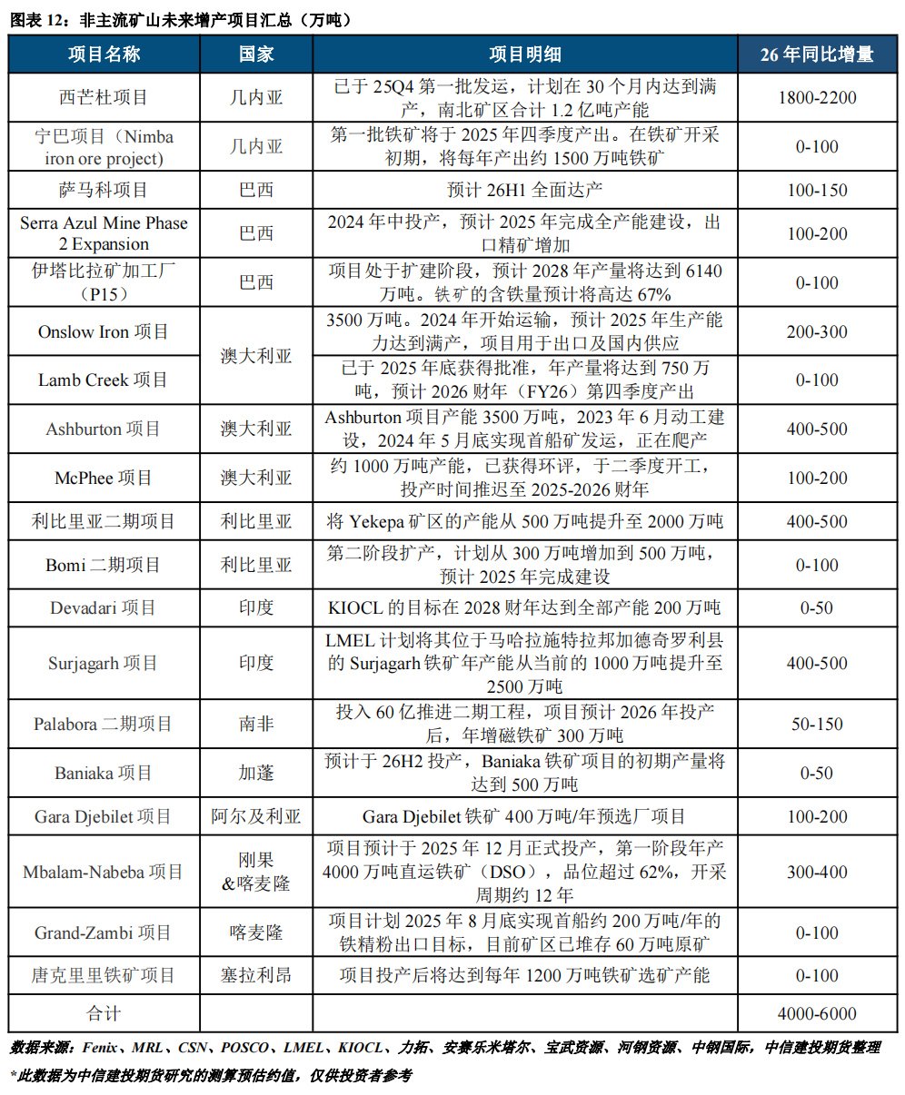 2026年海外矿山的提产主要依赖于主流矿山现有项目产能释放以及非主流矿山新项目投产。预计主流矿山的增量1200-1800万吨,非主流矿山的增量4000-6000万吨,合计增量5200-7800万吨,整体供应增长将进一步推动全球铁矿石市场的供给稳定。