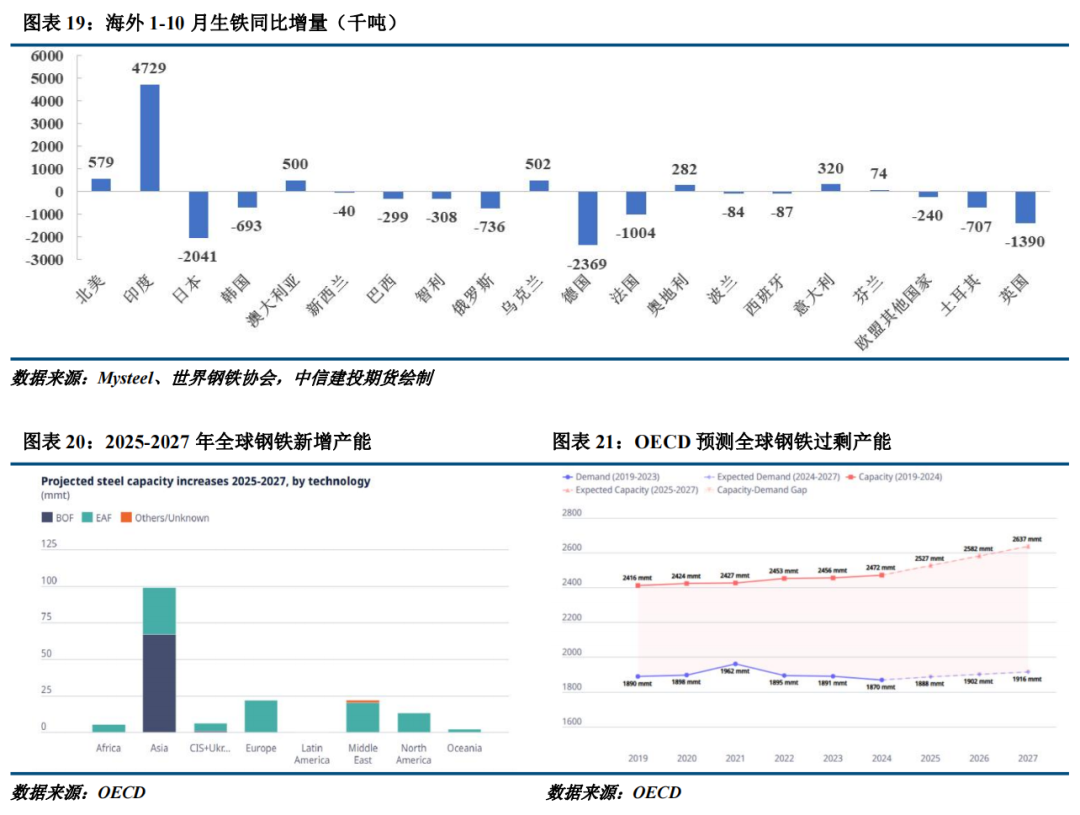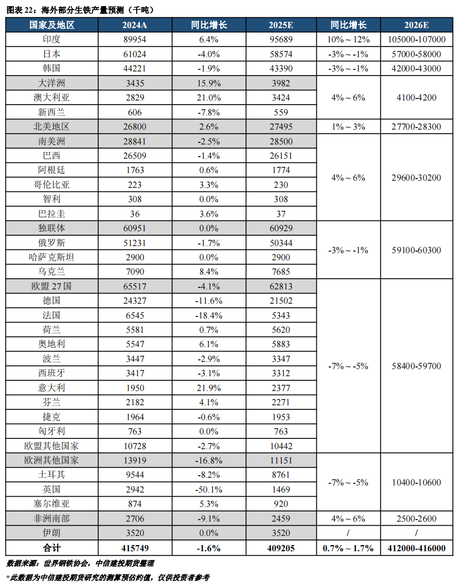 2026年海外生铁产量预计小幅增长,印度、东盟等新兴经济体贡献主要增量。根据OECD数据,2025-2027 年期间全球将新增1.65亿吨的钢铁产能,产能的投放主要集中在亚洲、欧洲和中东地区,这些地区的钢铁生产能力扩张将对全球铁矿需求产生直接影响。其中,新兴经济体预计贡献主要的增量,根据印度《国家钢铁政策2017)》,计划2030年将粗钢产能提升至3亿吨,并且明确倾向于发展高炉-转炉长流程工艺,2026年预计维持较高增速;而东盟生铁产量预计也将呈现显著增长,在东盟地区自身较高的经济发展和基础设施建设潜力需求和我国“一带一路”倡议的带动下,东南亚近年来吸引了大量中资企业新建钢铁工厂,为其钢材消费带来了长期的增长空间。整体来看,全球经济复苏前景仍存不明确因素,特别是考虑到日韩、俄罗斯、欧洲等国家地区生铁产量下滑的趋势难改,虽然世界钢铁协会在10月出台的2026年需求展望中给予了欧洲较高的增速,原因是欧洲地区基础设施和国防开支增加以及宏观经济条件改善,如通货膨胀降低、信贷条件宽松、实际家庭收入提高等,但在中性或保守预期下,欧洲生铁产量预计仍维持下滑趋势,不过跌幅有所收窄。综合来看,2026年印度预计贡献1000-1100万吨生铁增量,东盟贡献1200-1300万吨,其他国家以及地区贡献600-700万吨减量,预计2026年海外生铁产量或小幅增长,合计约有1500-1800万吨增量。