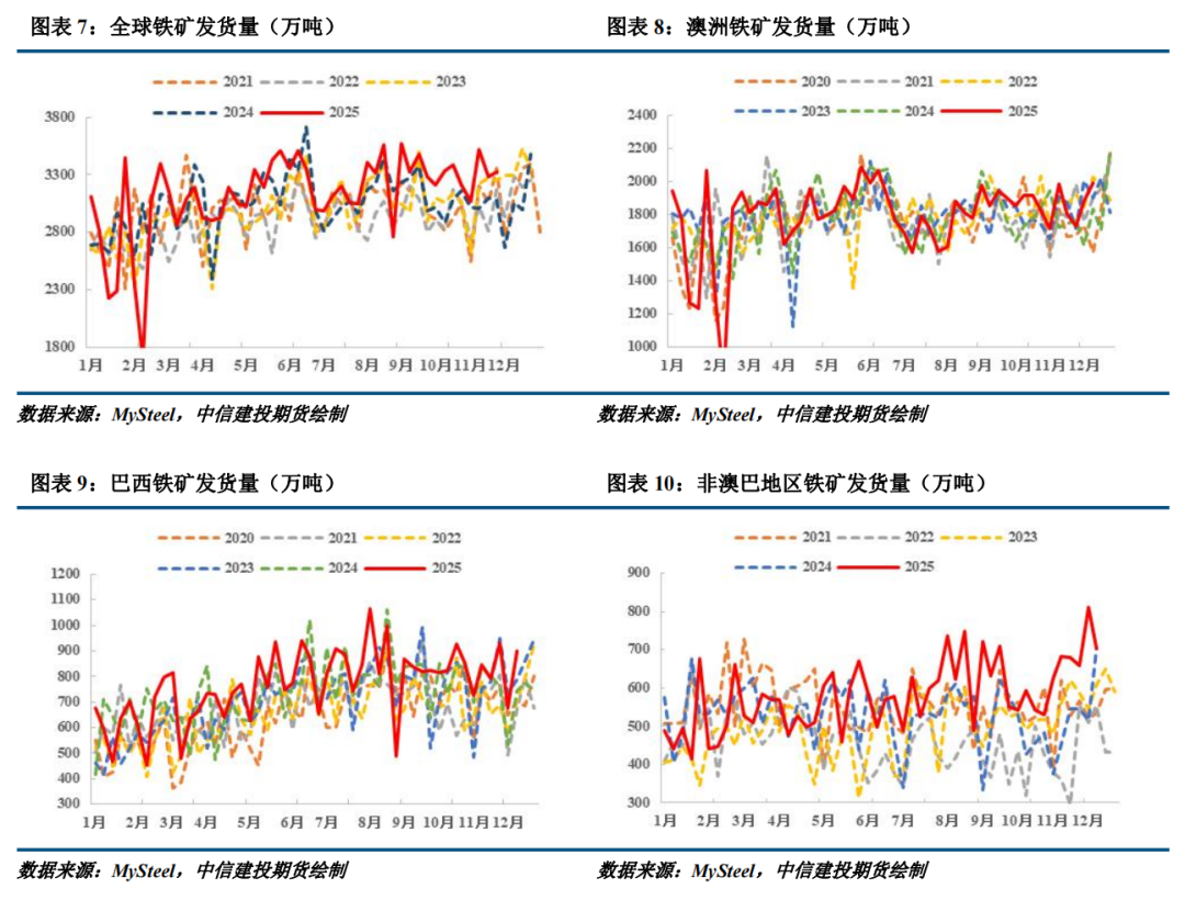 2025年全球铁矿发运总量继续保持在高位,非澳巴地区发运增长显著。截至12月12日,全 球铁矿发运量达到15.68亿吨,较2024年同期增加约4492.7万吨,同比增长2.95%。其中,澳大利亚的发运量较去年同期增长约239.4万吨,同比增长0.27%;巴西发运量增加约1615.6万吨,同比增长4.41%;非澳巴矿的发运增量约2637.6万吨,同比增长10.01%,增幅显著。