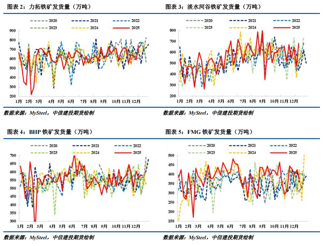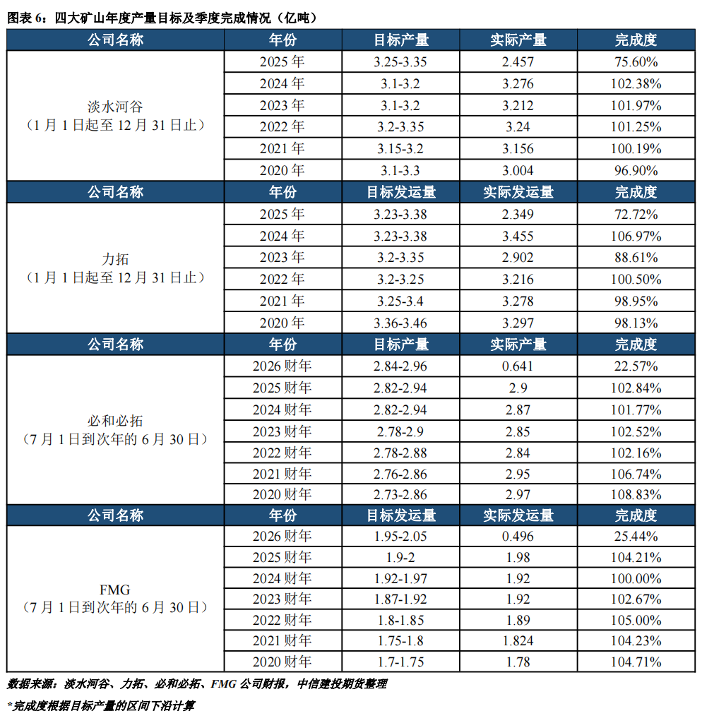 截至12月12日,FMG发运总量约1.93亿吨,同比增长922.1万吨。虽然仍受到极端天气影响,但由于FMG开采、加工等供应链环节的可靠以及对生产力的持续关注,且新增的铁桥项目爬坡顺利,供应增量显著,FMG贡献了2025年四大矿山主要的增量。根据最新财报,FMG 2026财年(25/07-26/06)目标产量维持1.95-2.05亿吨,较前期目标上移500万吨。