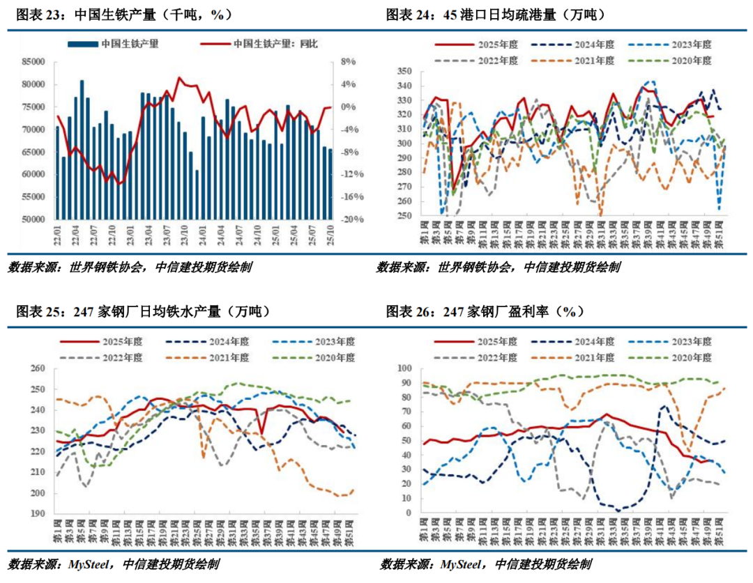 2025年生铁产量下行,而铁水保持强势。生铁口径来看,根据世界钢协,2025年中国生铁产量下降明显,1-10月份生铁产量累计7.07亿吨,同比下降1073万吨,降幅 1.5%;根据国家统计局,1-10月份生铁产量7.11亿吨,同比下降1.8%,与世界钢铁协会的统计基本匹配。铁水口径来看,截至12月12日,全年247家钢厂日均铁水产量在237.0万吨附近,同比增长3.2%,钢厂的生产积极性较高,年内铁水产量大部分时间都维持在历史同期高位,即使进入三季度后,钢厂盈利率开始下滑,年底跌至4成以下,但钢厂仍维持了较高的生产水平。疏港量口径来看,截至12月12日,全年45港口日均疏港量约318.5万吨,同比增长3.0%,与铁水口径匹配。整体来看,不同统计口径下的铁矿需求存一定差异,粗钢、生铁产量下行,而铁水产量、疏港量增长,并结合今年下游相对平淡的五大材数据,推测不同口径差异较大或有铁水分流至更多钢材品类和间接出口的原因,2025年铁矿实际需求或好于生铁产量口径反映的情况。展望2026年,按照两种口径估算,预计中国全年生铁产量维持下滑或持平,主因是国内房地产拖累难改,而基建、制造业延续发力,出口则继续受到新兴经济体带动,生铁口径的减量预计在0-600万吨。
