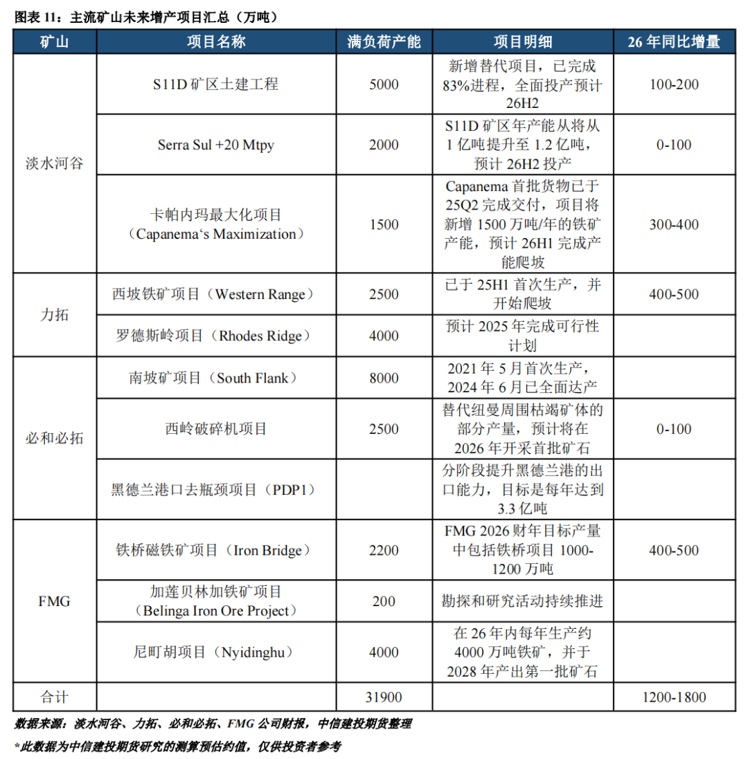 主流矿山方面,2026年产量增量的主要贡献来自于淡水河谷的Capanema项目、力拓的西坡项目以及FMG的铁桥项目。具体来看,淡水河谷2026年的产量指引为3.35-3.45亿吨,较上期增长0-0.1亿吨,具体来看主要由Capanema项目、S11D矿区土建工程以及Serra Sul +20 Mtpy项目贡献,合计产量同比增量在400-700万吨。力拓目前2025年仍维持3.23-3.28亿吨的发运指引,2026年的增量主要来自于西坡项目的爬坡,预计产量同比增量在400-500万吨。BHP 2026财年(25/7-26/6)产量指引在2.84-2.96亿吨,且暂无即将释放的新增项目,预计产量同比增量在0-100万吨,增量空间有限。FMG 2026财年(25/07-26/06)发运指引在1.95-2.05亿吨,较上一年目标上移500万吨,主要来自于铁桥项目的爬产,预计产量同比增量在400-500万吨。合计来看,主流矿山2026年预计产量同比增量在1200-1800万吨。需要注意的是,力拓、淡水河谷等目前都是以新增项目来对资源枯竭项目代替、补充以及升级,故主流矿山2026年的实际增量释放或还有一定抵消。