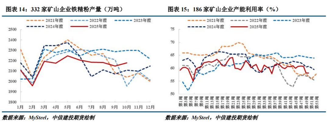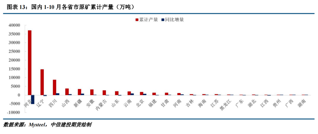 2025年国内矿山生产偏弱,主要是国内安全生产检查和海外矿价格压制等原因。根据钢联口径,2025年1-10月国内332家矿山企业铁精粉累计产量为2.16亿吨,同比减少295.3万吨,降幅为1.4%。按原矿产量口径计算,2025年1-10月中国原矿产量为8.52亿吨,同比下降1980.8万吨,降幅为2.3%。分区域看,河北、辽宁、四川仍然是产量大省,但河北、辽宁贡献主要的减量,同比分别下降4968.5万吨、450.6万吨,而四川、云南、新疆、北京贡献较高的增量,同比分别增长917.1万吨、833.8万吨、746.6万吨、609.6万吨。2022年“基石计划”提出,到 2025年要比2020年新增1亿吨铁精矿产量,即达到3.7亿吨。而从目前的情况来看,完成难度较大,一方面2025年铁矿价格中枢较2024年有所下移,且国内铁精粉成本本就多高于海外,开采利润不佳,其需求受到抑制,而进口矿则更受青睐。另一方面,近年来矿山安全要求提高、环保政策趋严,亦限制了国内矿的生产与开发。