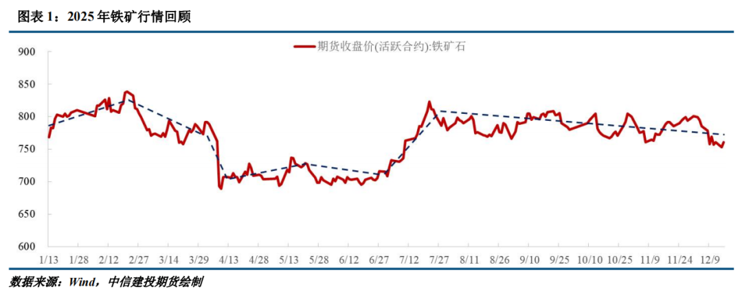 回顾2025年,铁矿呈现出“先跌后涨,宽幅震荡”的走势特征。高铁水产量的“强现实”托底矿价,粗钢压减、关税扰动、“反内卷”等宏观影响因素驱动行情大幅波动。2025年Wind连铁期货盘面活跃合约价格主要运行于690-840元,SGX TSI铁矿CFR中国(62%铁粉)主要运行于87-105美元。