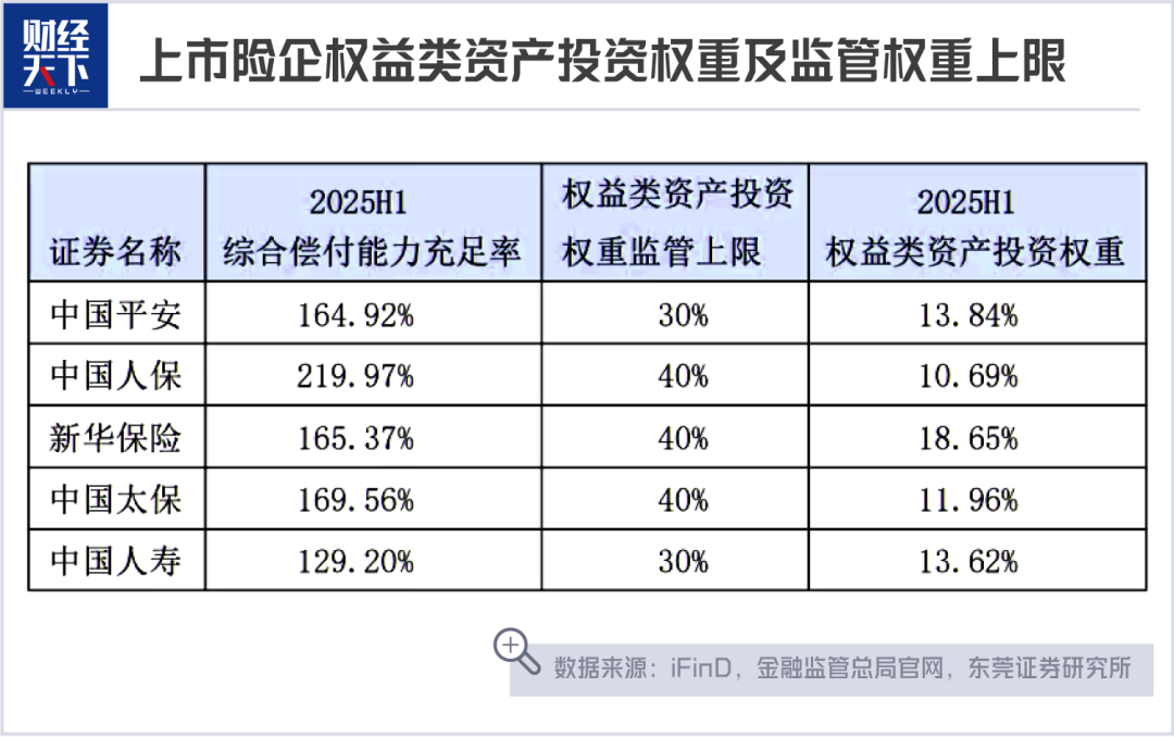 东莞证券一份研报显示,2025年上半年,五家A股上市险企的权益资产投资权重在10%~20%之间,远低于30%~40%的监管上限。