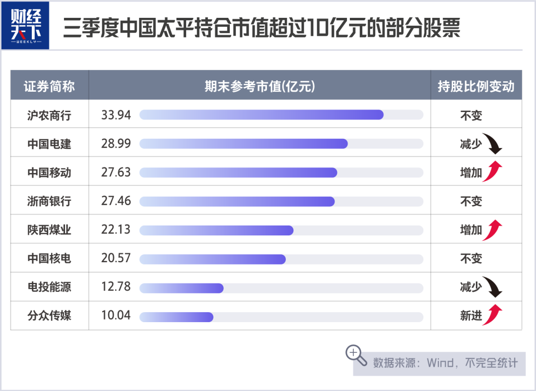 从重仓程度来看,截至三季度末,中国太平比较钟情银行股和“中”字头股票。