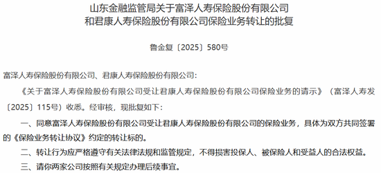 12月16日,山东金融监管局公告同意富泽人寿受让君康人寿的保险业务。同时,监管官网还发布了之前审批的诸多批文,包括富泽人寿获批筹建、获批开业、董事长总裁任职资格,以及其他高管、董事的任职资格等。