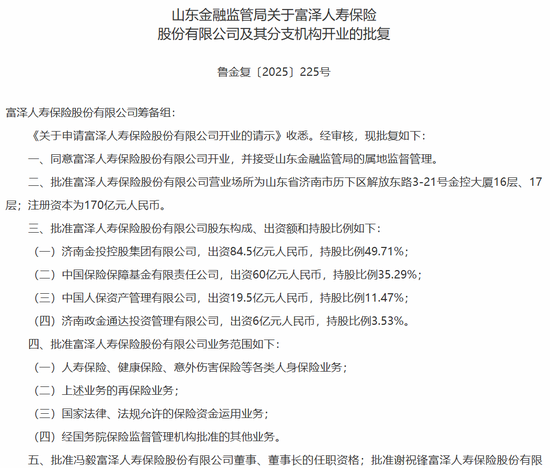 此前,富泽人寿与其26家分支公司保险许可证获批,富泽人寿注册资本170亿元,股权结构中地方国有资本占比超53%,董事长冯毅出身地方金融监管局局长,总裁谢祝锋为新生代财务线出身总裁代表,班子成员达9人。