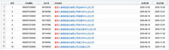 除了总公司保险许可证下发,监管官网近日也陆续发布了该公司各分支机构保险许可证相关信息。