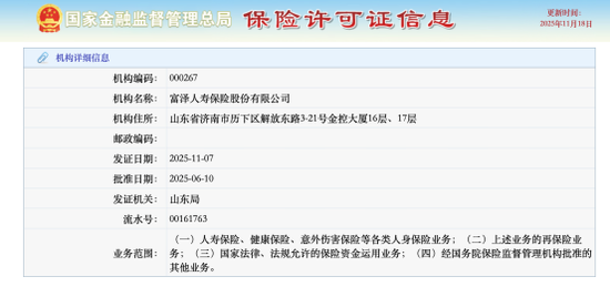 在此之前的11月10日,金融监管总局官网也已公布了富泽人寿于今年6月10日获准的保险许可证信息。