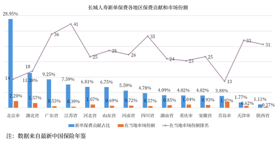 从内部贡献来看,北京作为长城人寿总部所在地,贡献了长城人寿总保费的28.95%,这种“一枝独秀”的结构分布,也暴露了长城人寿跨区域经营能力还有待提升,全国化布局任重道远。