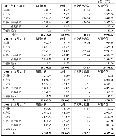 2015年至2018年6月末,神马电力存货金额分别为6373.66万元、1.37亿元、1.59亿元和9900.13万元,占同期流动资产总额的比例分别为18.99%、28.13%、30.23%和17.22%,占同期营业成本的比例分别为27.21%、47.58%、39.66%和47.05%。