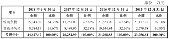 2015年至2018年6月末,神马电力负债总额分别为2.38亿元、3.20亿元、2.63亿元、2.46亿元,资产负债率分别为37.49%、38.72%、29.74%、26.48%。