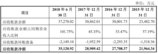 2018年6月末,公司应收账款余额占同期营业收入比例为101.75%,增长幅度较大,主要是由于2018年上半年销售形成的应收账款所致(2018年1-6月应收账款余额占年化后营业收入的比例为50.88%,主要是由于下游电网类客户和设备类客户业务性质所致)。