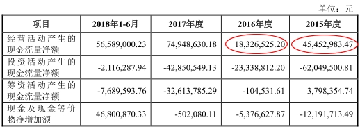 2017年12月19日报送的招股书显示,2015年、2016年公司经营活动产生的现金流量净额为7107.02万元、6536.18万元。