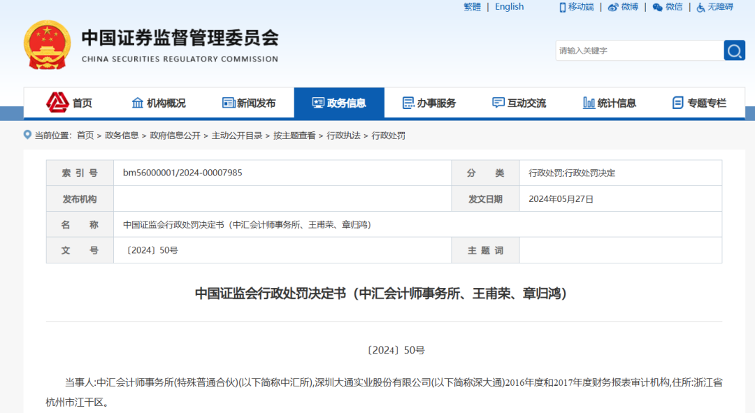 一、对中汇会计师事务所(特殊普通合伙)责令改正,没收其对深大通2016年、2017年财务报表审计业务收入1,297,169.78元(不含税),并处以1,297,169.78元的罚款;