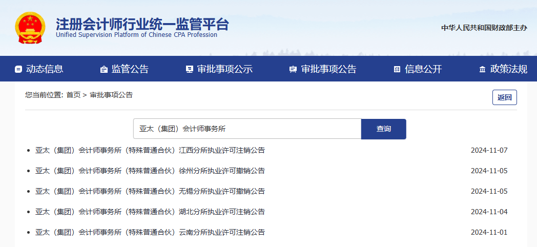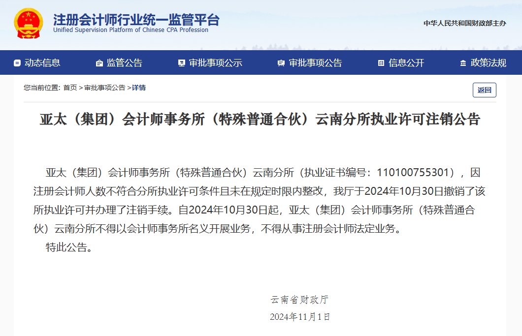 亚太(集团)会计师事务所(特殊普通合伙)云南分所(执业证书编号:110100755301),因注册会计师人数不符合分所执业许可条件且未在规定时限内整改,我厅于2024年10月30日撤销了该所执业许可并办理了注销手续。自2024年10月30日起,亚太(集团)会计师事务所(特殊普通合伙)云南分所不得以会计师事务所名义开展业务,不得从事注册会计师法定业务。