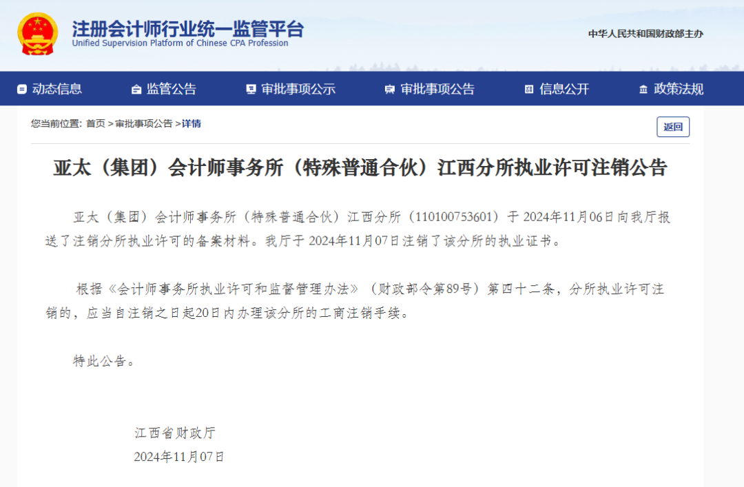 亚太(集团)会计师事务所(特殊普通合伙)江西分所(110100753601)于 2024年11月06日向我厅报送了注销分所执业许可的备案材料。我厅于 2024年11月07日注销了该分所的执业证书。