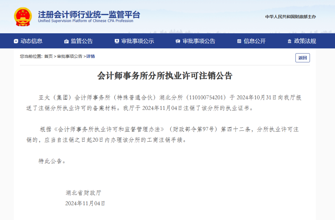 亚太(集团)会计师事务所(特殊普通合伙)湖北分所(110100754201)于 2024年10月31日向我厅报送了注销分所执业许可的备案材料。我厅于 2024年11月04日注销了该分所的执业证书。