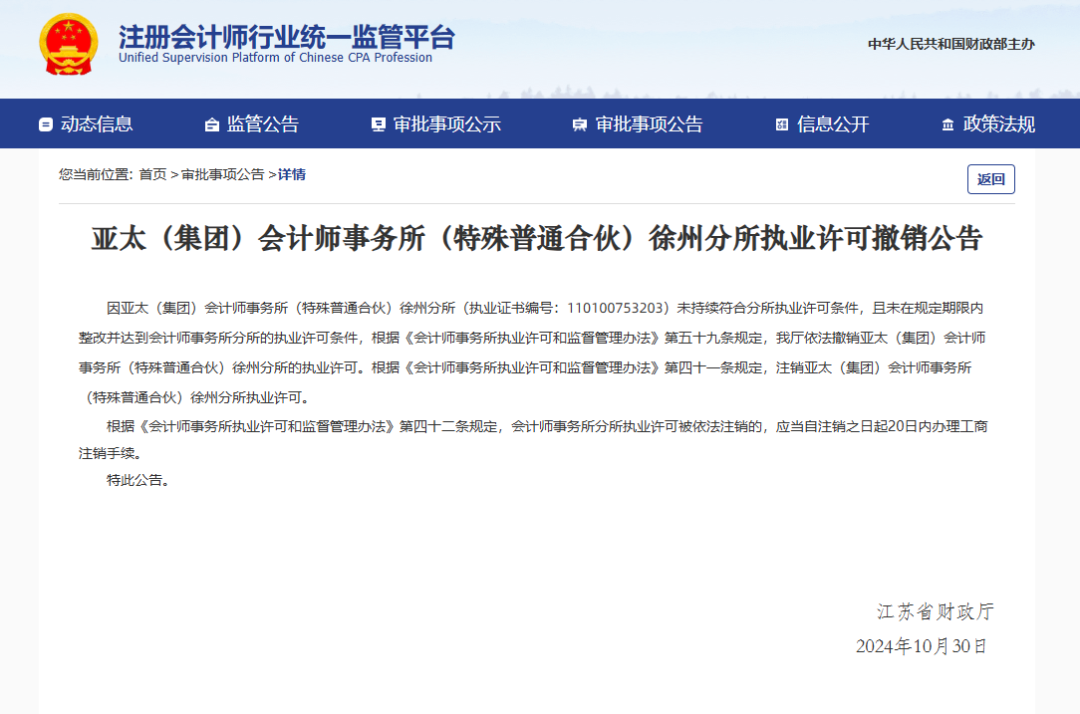 因亚太(集团)会计师事务所(特殊普通合伙)徐州分所(执业证书编号:110100753203)未持续符合分所执业许可条件,且未在规定期限内整改并达到会计师事务所分所的执业许可条件,根据《会计师事务所执业许可和监督管理办法》第五十九条规定,我厅依法撤销亚太(集团)会计师事务所(特殊普通合伙)徐州分所的执业许可。根据《会计师事务所执业许可和监督管理办法》第四十一条规定,注销亚太(集团)会计师事务所(特殊普通合伙)徐州分所执业许可。