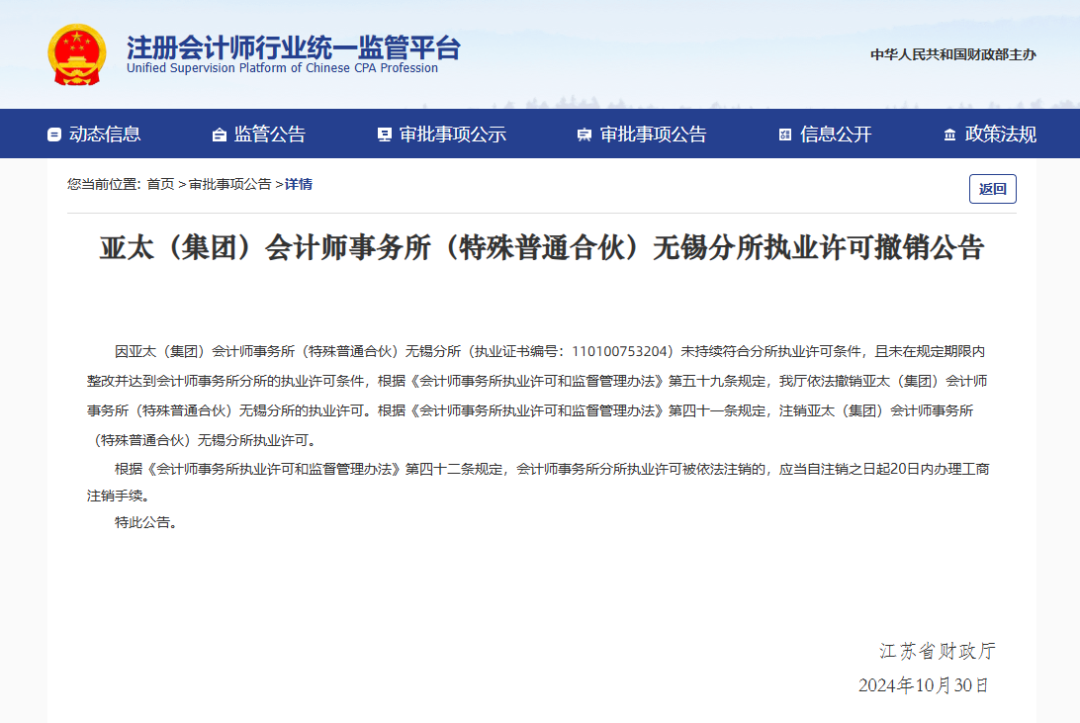 因亚太(集团)会计师事务所(特殊普通合伙)无锡分所(执业证书编号:110100753204)未持续符合分所执业许可条件,且未在规定期限内整改并达到会计师事务所分所的执业许可条件,根据《会计师事务所执业许可和监督管理办法》第五十九条规定,我厅依法撤销亚太(集团)会计师事务所(特殊普通合伙)无锡分所的执业许可。根据《会计师事务所执业许可和监督管理办法》第四十一条规定,注销亚太(集团)会计师事务所(特殊普通合伙)无锡分所执业许可。