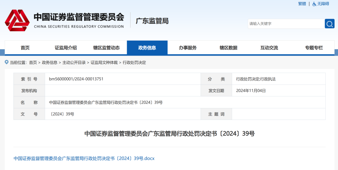 2024年11月4日中国证券监督管理委员会广东监管局行政处罚决定书〔2024〕39号