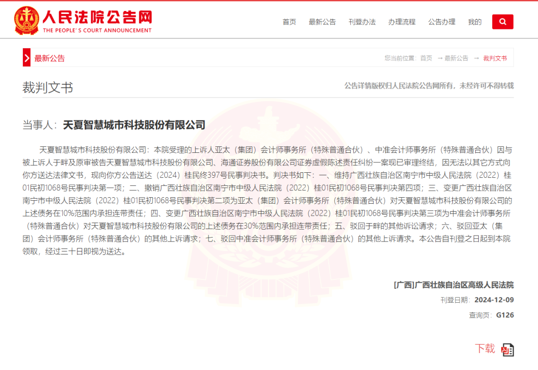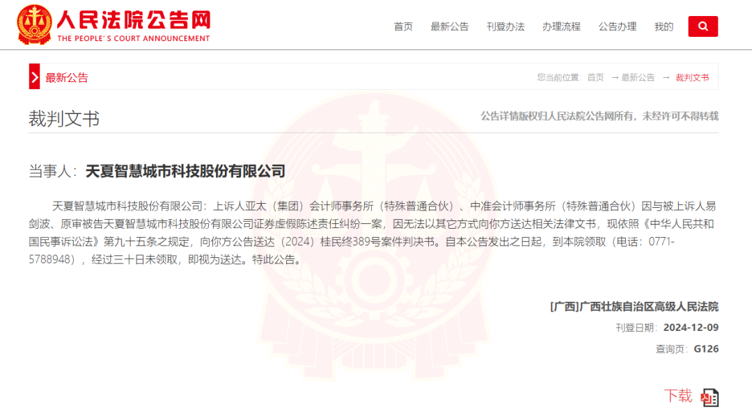 天夏智慧城市科技股份有限公司:上诉人亚太(集团)会计师事务所(特殊普通合伙)、中准会计师事务所(特殊普通合伙)因与被上诉人易剑波、原审被告天夏智慧城市科技股份有限公司证券虚假陈述责任纠纷一案,因无法以其它方式向你方送达相关法律文书,现依照《中华人民共和国民事诉讼法》第九十五条之规定,向你方公告送达(2024)桂民终389号案件判决书。自本公告发出之日起,到本院领取(电话:0771-5788948),经过三十日未领取,即视为送达。特此公告。