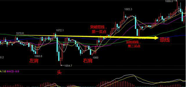 头肩底是一种典型的趋势反转形态,是下跌尾声出现的强烈看涨形态,图形以左肩、头、右肩及颈线形成,价格放量突破颈线阻力后则底部形成走上升行情,最小量度涨幅一般都大于颈线与最低点之间的垂直高度。