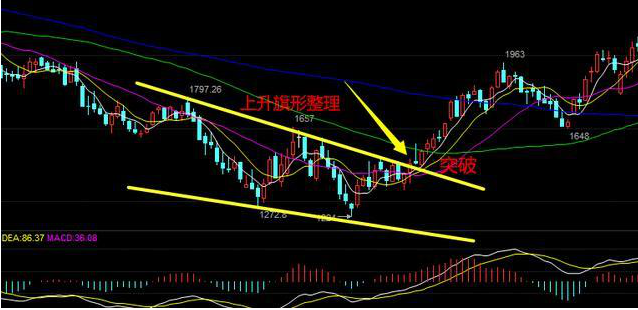 上升旗形指价格震荡下行,高点依次下移,同时低点也逐步下移,形成旗面整理,最终向上突破完成整理形态展开上升。