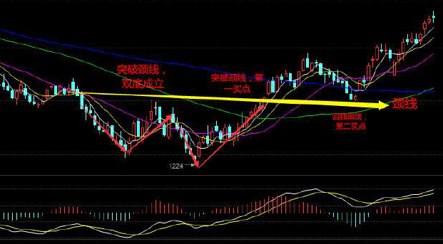 构筑双底突破向上,价格突破颈线为第一买点,价格回抽颈线为第二买点,如果是放量突破颈线则可靠性更高,双底形态突破后的最小量度涨幅为底部低点到颈线的垂直距离。