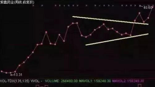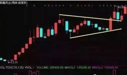 上升旗形整理形态在旗形形成之前和被突破之后,成交量都很大。在旗形形成过程,成交量从左向右逐渐减少。