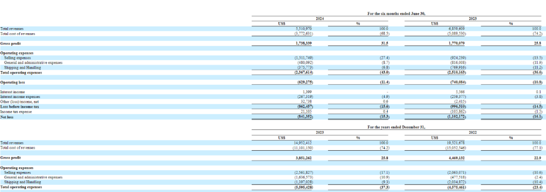 而从索芙特最新的招股书来看,其经营状况并未好转。据招股书披露,2022年、2023年和2024年前六个月,索芙特的收入分别为1952.17万美元(约合人民币1.42亿元)、1495.24万美元(约合人民币1.09亿元)和 551.1万美元(约合人民币4013.84万元),相应的净亏损分别为44.95万美元(约合人民币327.39万元)、228.54万美元(约合人民币1664.53万元)和 84.14万美元(约合人民币612.82万元)。也就是说,该公司在报告期内,均为亏损状态。
