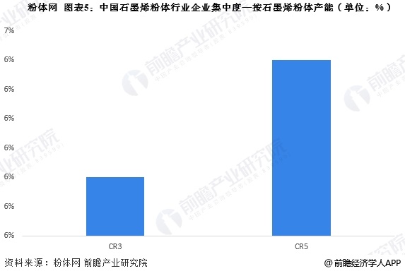 根据《中国石墨烯产业发展蓝皮书》披露的数据显示,2023年我国石墨烯粉体产能达到2万吨,结合粉体网披露的中国石墨烯粉体实力企业产能情况,2023年中国石墨烯粉体行业CR3为6%,CR5也仅有6.4%,市场集中度较低。