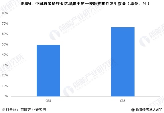 从融资事件发生的数量来看,我国石墨烯行业市场区域集中度较高,CR3达到50%,CR5超过66%,达到66.8%,融资事件主要发生在江苏、广东等发达地区。