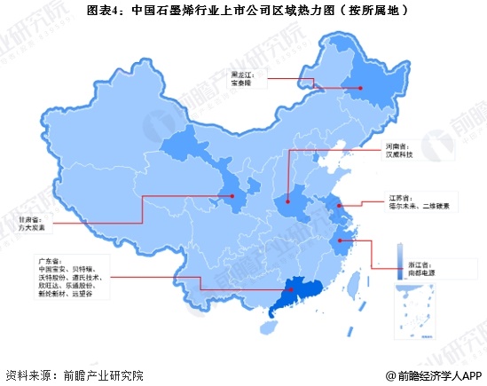 石墨烯上市公司主要分布在广东地区,且企业数量较其他地区有明显差距,石墨烯产业链建设完善。其他省份也有一定数量的石墨烯上市企业分布,内地的黑龙江、甘肃,主要分布石墨烯原材料相关上市企业,以及沿海的浙江、江苏,主要分布石墨烯制造企业。
