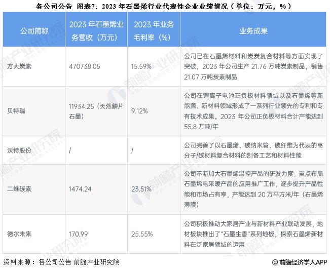国内石墨烯企业以中小企业为主。领先上市企业包括贝特瑞、方大炭素、二维碳素、沃特股份等,各个企业石墨烯业务布局各有侧重。2023年,方大炭素作为石墨烯行业中的龙头企业,石墨烯业务营收为47.07亿元;从毛利率来看,二维碳素和德尔未来石墨烯业务毛利率较高,均超过25%。各公司的主要业务业绩情况如下所示: