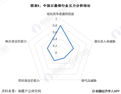 根据以上分析,对各方面的竞争情况进行量化,1表最大,0代表最小,中国石墨烯行业的竞争情况如下图所示: