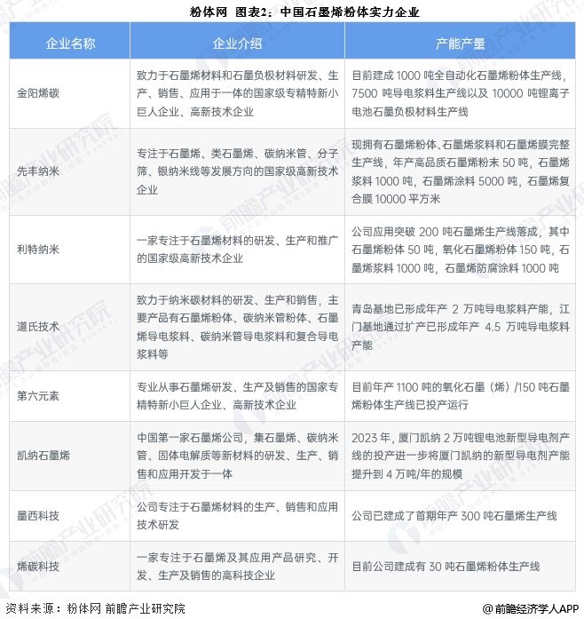 目前中国石墨烯材料市场主要以石墨烯粉体为主,占整体市场的较大比例,根据粉体网,国内石墨烯粉体实力企业如下:
