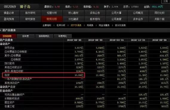 第二种是存货减值,比如去年推到风口浪尖的獐子岛,公告称扇贝饿死了,有可能出现存货减值,我们看一下獐子岛的数据,存货10.84亿,总负债才34.07亿,占比32%,营业收入也才20.11亿,占比都非常高!如果这些存货全部减值,那简直就是毁灭性的打击!所以如果一家公司的存货特别大的,需要去了解这些存货是否有减值的风险了。