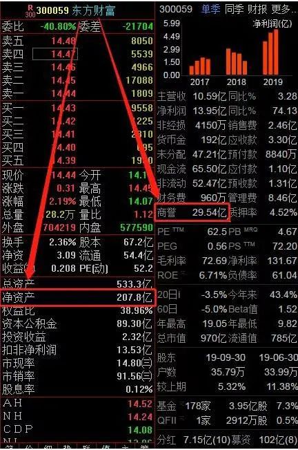 当然也不是所有商誉值很大的公司都会暴雷,需要我们去分析这公司的具体情况,比如东方财富商誉值29.54亿,净资产207.8亿,占比14%,接近20%,也是挺高的,但是我们细看这个29.54亿的商誉,原来是由于东财当年收购了同信证券产生的,很明显这个商誉是99.99%都不会有减值的,因为现在东财的发展已经非常好了,成为了中国最优秀的互联网券商,东财这个品牌可以说是家喻户晓了,所以这些商誉几乎是不会有减值的风险。