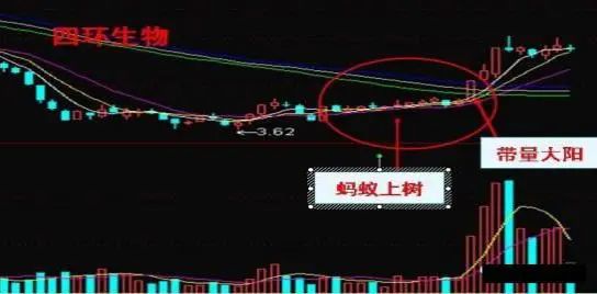 ③带量大阳:超过5点的大阳线起来,带3倍以上的成交量