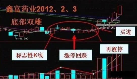 “底部双雄”的特点就是在底部涨停后回踩再涨停的形态,它的技术要点是: