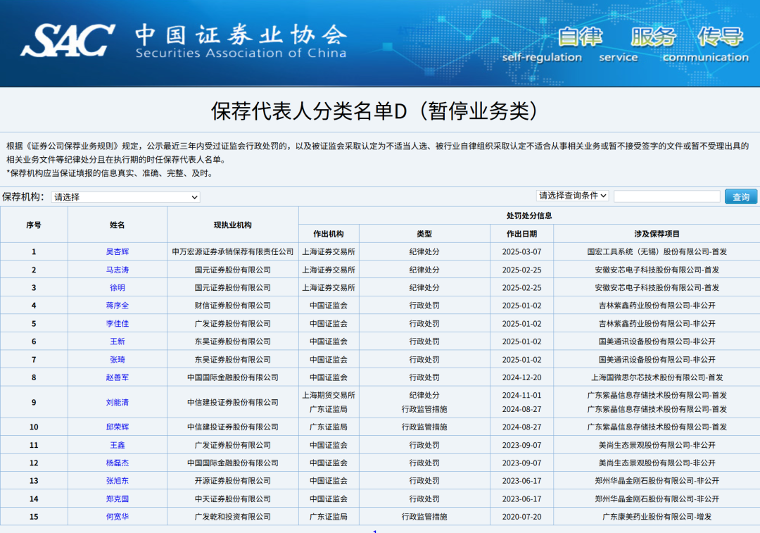 中证协更新保代D类名单(暂停业务黑名单),新增8名保代,涉及6家券商,因IPO、定增项目失职被罚,目前黑名单共15人。